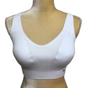 NWOT. White Seamless Sports Bra Women Various Sizes. Pull on style, adjustable slide, convertible back straps, removable padding, seamless and tagless, moisture wicking, logo front bottom left. Pictures are part of description.