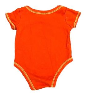 * Details: Cute and sporty 100% cotton Puma outfit, featuring a neon orange and yellow onesie / bodysuit and gray pants with an orange stripe and yellow Puma logo.