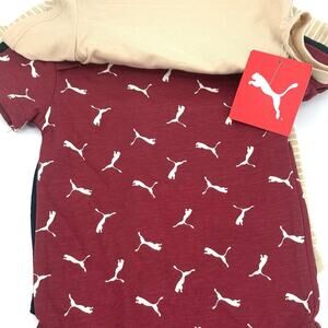 The Puma One Piece Baby Bodysuit 4 Piece Set in size 6-9 months is a stylish and comfortable outfit for your little one. Made from a blended fabric with a crew neck and snap closure, this onesie features a colorful striped pattern with the Puma logo accent. Perfect for casual occasions in all seasons, this set includes a bodysuit that is both machine washable and short-sleeved for ease of dressing. With a sporty theme, this one-piece is a versatile addition to any little boy's wardrobe.