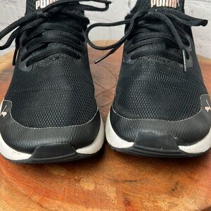 Black with light pink PUMA on back of heel. Cream accent around sole. Size 7.5. Gentle wear. Please review all photos for wear condition.