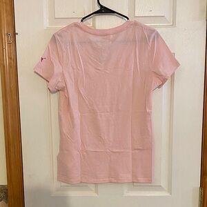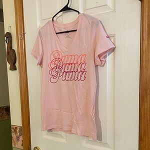Soft pink Puma V-neck tee with layered gradient script logo. Short sleeves and casual fit. Comfortable lightweight cotton blend. Easy to pair with jeans or shorts.