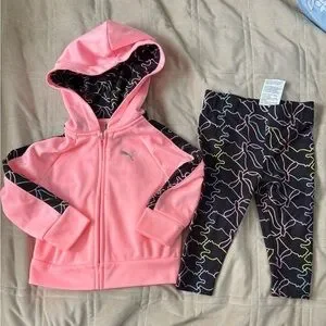 Vibrant pink jacket with stylish black leggings. Features iconic Puma logo.