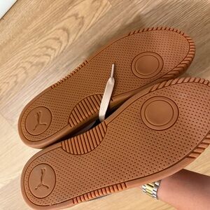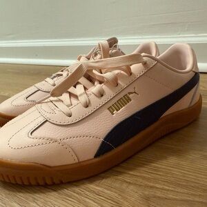 Stylish pink sneakers with black accents. Features the iconic Puma logo.