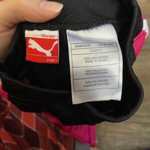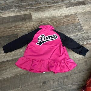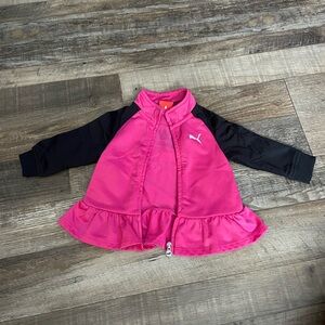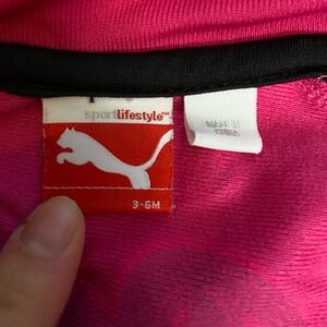 Vibrant Puma tracksuit with pink jacket and black pants. Size 3-6 months. Puma logo on both pieces along with white & pink stripe down the side of the pants. Comfortable and stylish. Preowned good condition washed and worn but no visible signs of damage.