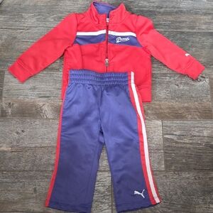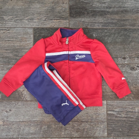 Stylish Puma set with zip up jacket and pants. Features white stripe accents. Comfortable and sporty. Hardly used, runs a bit small.