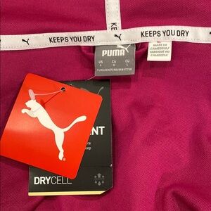 This vibrant Puma jacket showcases a hot pink hue accented by a bold white stripe, offering a dynamic and sporty look. Designed with a full-length zipper and a cozy hood, it provides both comfort and style for athletic activities or casual wear. The soft, fleece-like texture ensures a relaxed fit, making it a versatile addition to your wardrobe. Color is a slightly creamy white. Puma logos are crisp white.
