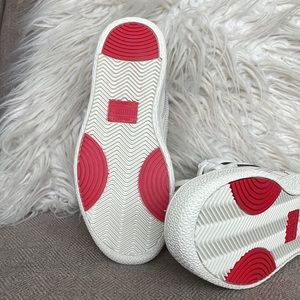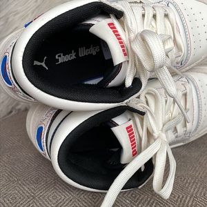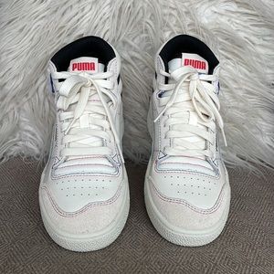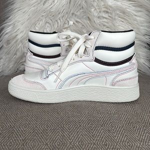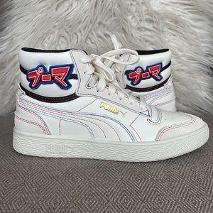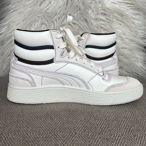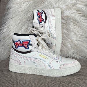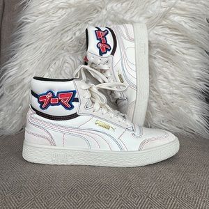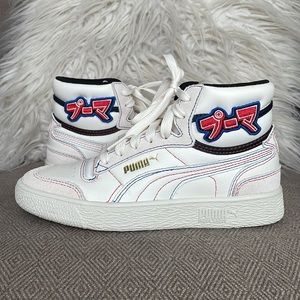 NWOT Never worn! SUPER RARE! Whisper White/Black/High Risk Red. The PUMA Ralph Sampson Mid ‘Japanorama Pack’ brings a touch of Tokyo style to a classic silhouette. The off-white leather build and tonal suede overlays are stylish and timeless, while the blue and red stitching provides a pop of color. The brand’s name is embroidered in Japanese lettering across the lateral ankle, complementing a gold-foil PUMA wordmark stamped on the quarter panel.