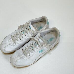 These lightweight Puma Roma sneakers boast a retro yet timeless design, crafted with durable leather and enhanced with a gum sole for superior grip. Featuring a clean white body with teal accents, these low-top sneakers combine style and comfort seamlessly. Ideal for casual outings, they provide a slightly wider fit for added ease.