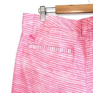 Puma "shocking pink" streaked/ striped shorts in a moisture wicking athletic style. Size 14. In NWT condition. Polyester, spandex and cotton materials.