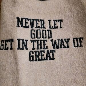 "Never let good get in the way of great" legend on the right arm.