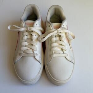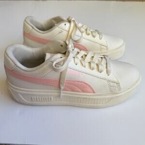 Size Women's 7 Puma Smash V3 Platform Sneakers. Warm White and Rose Dust pink stripe. Super cute sporty leather sneaker with comfortable cushioning and a platform sole. 1" platform, round toe, lace up ties and padded collar. Leather upper and rubber sole. Worn once for an hour. Basically new. No flaws.