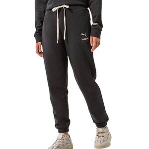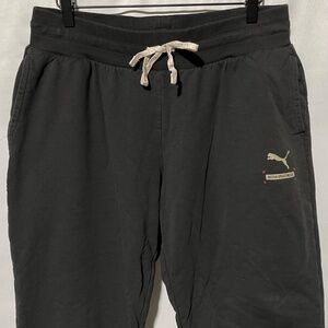 Puma Joggers. Pull on. Ribbed elastic waistband. Speckled adjustable drawstring ties at the waist. Side pockets. Better Sportswear logo printed at the wearer's left side near the pocket. Elastic cuffs. Main material: 100% cotton. Rib material: 96% cotton 4% elastane. Solid color, but it's not a dark saturated black. It looks just a shade lighter.