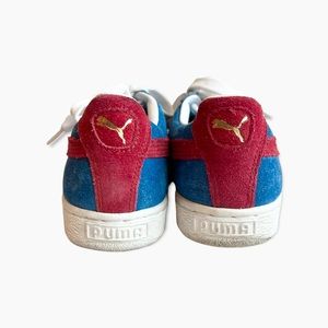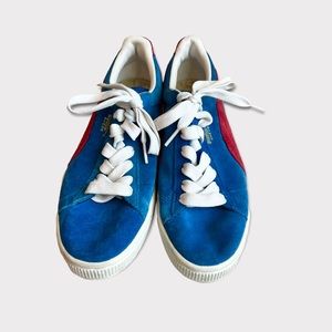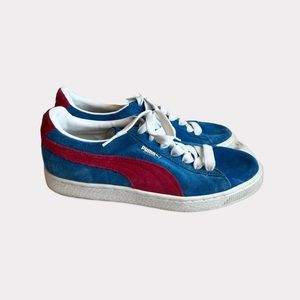 The Puma Suede is one of the most recognizable Puma sneakers ever created. This simple design with fresh lines and Puma Formstripe was originally released in 1968, and is often customized with a pair of fat laces. In the 80s they gained popularity on the streets as the "go to" sneaker. Sz 7. Excellent condition.