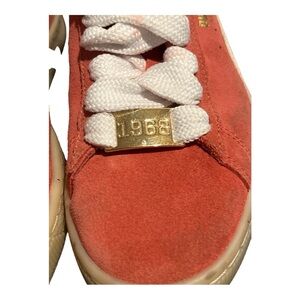 Vibrant Puma Coral suede shoes with white detailing. Features chunky laces and gold 1968 accents.
