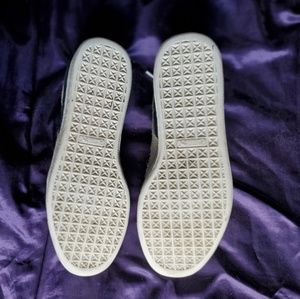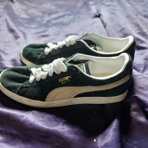 Gently used (basically brand new) Puma Suede's for men. Someone stole one of the laces so I swapped them with the spare pair in the box. Would still recommend the black laces.