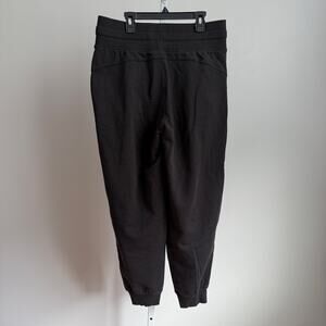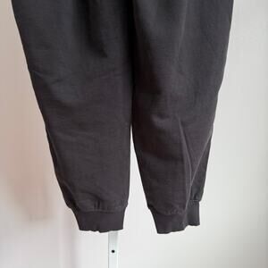 These are pre-owned Puma sweatpants, size M. The pants are black and made of 100% cotton shell and 96% cotton and 4% elastane rib. They feature an elastic waistband with a drawstring, and elastic cuffs. There is a Puma logo on the upper left leg. The pants have a relaxed fit and show some signs of wear, including slight fading.