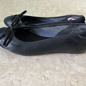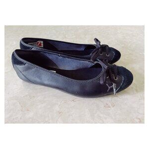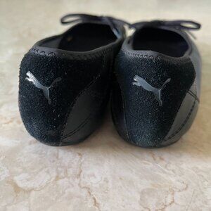 Y2k Puma Lily ballet flat shoes in a size 7.5 women's. Black leather and suede with tie up lace up toe detail. Puma logo on heel and side of shoe. Cushioned footbed and heel. Rubber sole. Rounded toe. In very good vintage condition. Very light wear shown in photos.