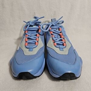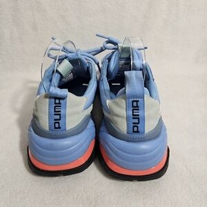 Pre-owned Puma Thunder Spectra sneakers, size men's 9.5. They come in blue with coral accents, light wear to the tread, minimal signs of wear, overall excellent used condition.