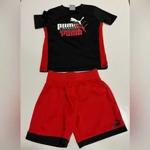 Puma Toddler Boys 2-Piece Athletic Set Red Black Logo Tee & Shorts Size 3T