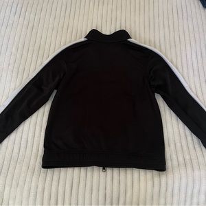Puma brand black track jacket with white and pastel blue stripes down the sleeves. Full zip front with 2 zipper pulls. Front pockets.