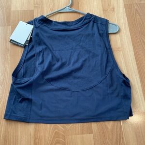 The color is a darker green/blue. Name of color is “spellbound.” It’s a moisture wicking material and the bottom part of the back is a sheer material. Worn as a crop-style.