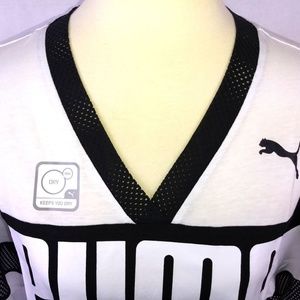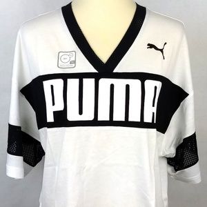 Item: Puma White W/ Black Stripe Cropped Logo Top. Available in Women's Size Small (S) and Medium (M). Made to be loose fitted