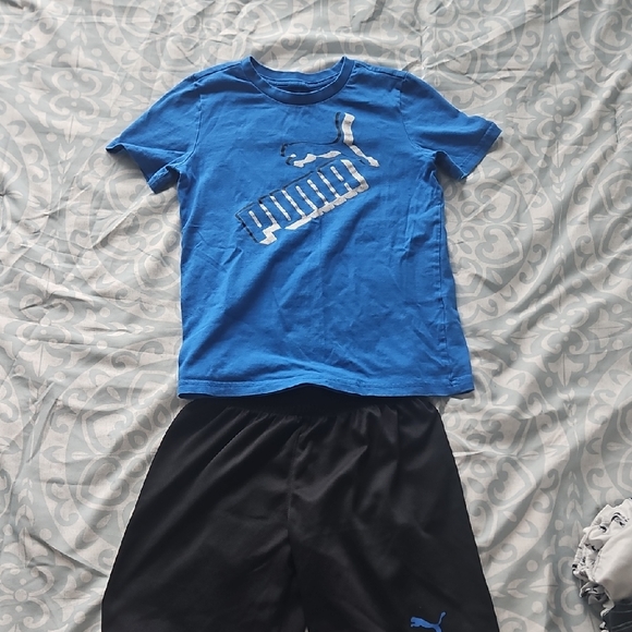 Bright blue Puma t-shirt with iconic logo. Paired with sleek black shorts. Perfect for casual wear.