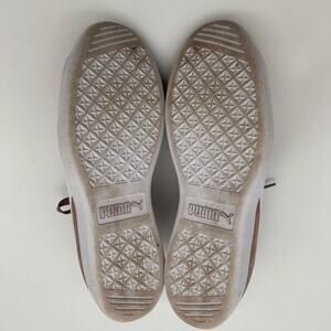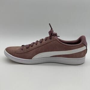 Lightly worn Puma Vikky Suede sneakers in women's size 8. Stylish purple color with classic suede upper, lace-up front, and cushioned insole for all-day comfort. Great for casual wear or light athletic use. Features Puma branding and durable rubber sole. Ideal for soccer practice, walking, or everyday activities. Clean and in good condition with minimal signs of use.