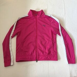 Vintage 2004 Puma track jacket in THE most fun shade of hot pink! Folks will definitely see you coming in this one - features white stripes along the sleeves and a black Puma logo. Front pockets, elastic waistband. Size S, but can likely comfortably fit anyone that wears XXS-S without being too fitted.
