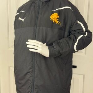Elevate your athletic wardrobe with the Puma Performance Jacket, designed in a sleek black with striking white accents. This full-zip jacket is crafted from a weather-resistant synthetic fabric, ensuring durability and comfort during any activity. The high collar adds a touch of sophistication, while the clean design embodies Puma's commitment to quality and style.jacket in good condition
