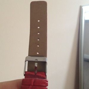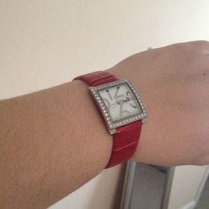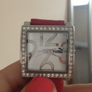 Slightly used, Puma Watch with a red snake skin or even alligator skin band look. Comfortable fit, needs a battery, it's in great condition. Rhinestone framing around the rim.