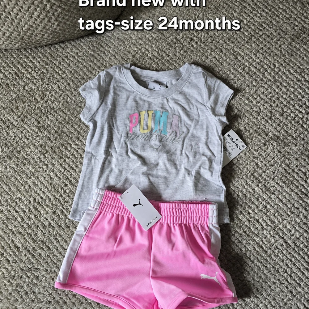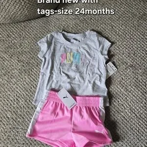 Puma short sleeve tee with multicolored pastel logo. Bright pink athletic shorts with white side trim and Puma logo. Coordinated sporty outfit for active play.