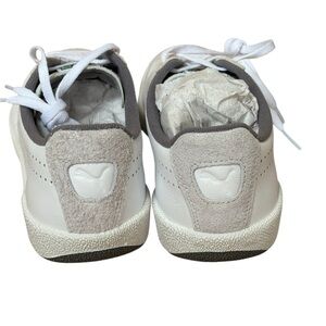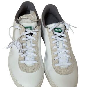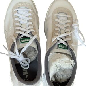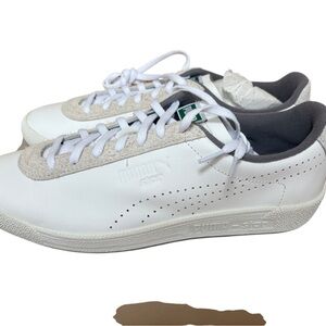 Stylish Puma sneakers. White leather with gray accents. Comfortable and trendy.