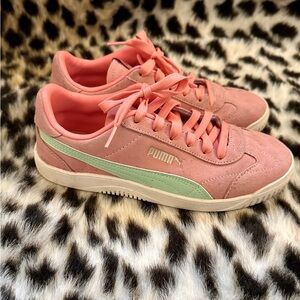 Chic Puma sneakers in coral with mint accents. Stylish and comfortable for any occasion. Lightly worn, sun faded but still stylish and trendy.