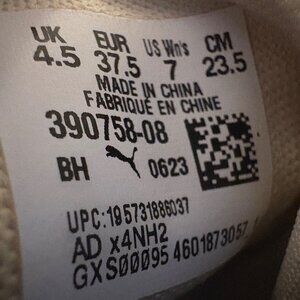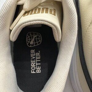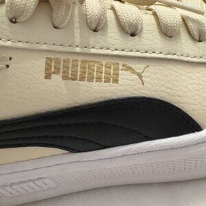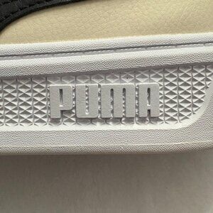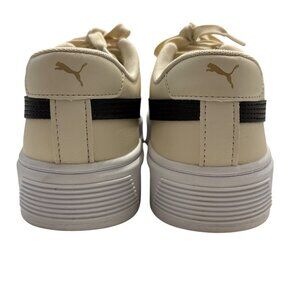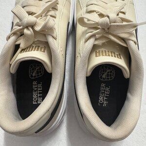 These Puma women's sneakers feature a sleek beige and black design with durable materials. Ideal for everyday wear, they combine comfort and style seamlessly.