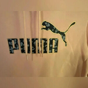 Like new, very gently worn. Sweatshirt is peach in color with iridescent gold outlining the wording and puma.