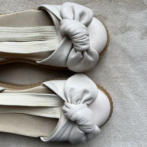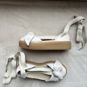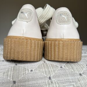 These on trend Puma Women's X Fenty by Rihanna Natural Oatmeal Cream Leather Sandals feature a solid pattern and lace-up closure. The low platform heel style and ankle strap add a unique touch to these sandals, while the cream color and bow accents give them a trendy twist. Crafted with high-quality leather and a rubber outsole material. They are available in US Shoe Size 6 and are suitable for women. These sandals are part of the Puma Fenty product line.