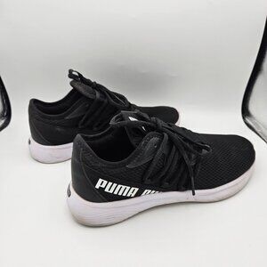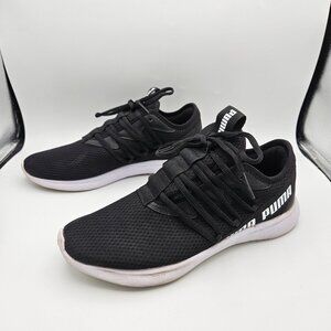 You will receive the above pictured Puma sneakers size 9 in black and white.