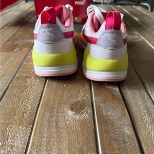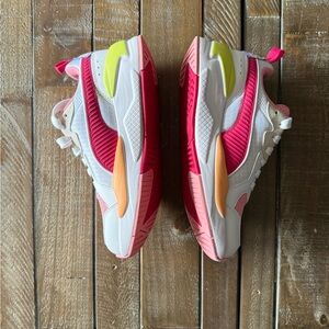 Dynamic sneakers with pink, white, and yellow tones. Ideal for active wear.