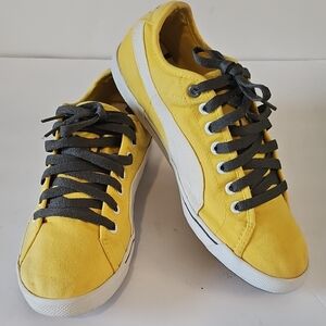 Vibrant yellow sneakers with black laces. Iconic Puma logo on the tongue.