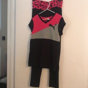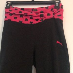 Puma top is pink/gray and black. Yoga pants are black with pink fold over waistband. Waistband has black glittery hearts