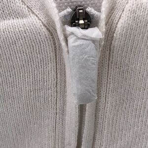 Puma zip front jacket/cardigan in cream with a turquoise band and boho drawings. It feel like a thin sweater material. New with out tags—zipper pull is still wrapped. Size L.