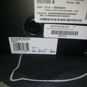 Used puma fenty pink bow sneakers. Only worn 1 time on a car trip 3 hrs from my house. Soles can be wiped off no stains on shoes outside. Slightly discolored inside due to me wearing black socks. Other than that they are perfect. With original box and dust bag.