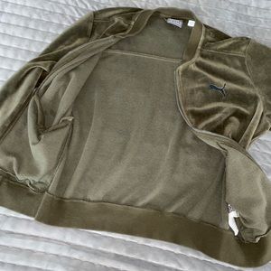 Olive green, soft outside. Two front pockets. In great condition, no holes or rips. Puma logo on front.