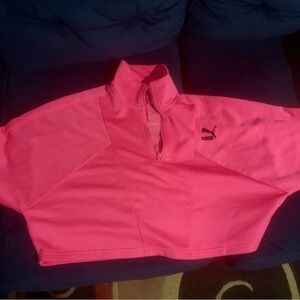 Never worn, but tag did come off. It has a slight oversized fit to it. Beautiful fluorescent, Barbie, pink color. Perfect for fall or winter. Or even going to the gym on a chilly night.