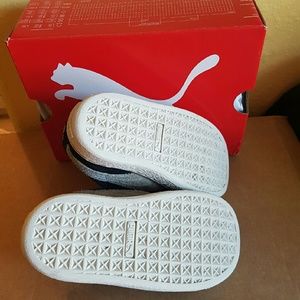 Puma kinder fit toddler boys suede shoes, size 8, color black, good conditions. It includes the original box.