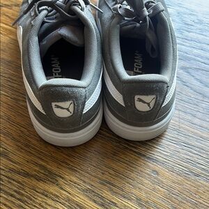 Experience the perfect blend of style and comfort with Puma's gray sneakers, featuring a sleek suede upper and a classic minimalist design. The lighter gray Puma stripe adds a subtle touch of elegance, while the white midsole provides a striking contrast. Ideal for everyday wear, these sneakers are a versatile addition to any wardrobe. Never worn outside.