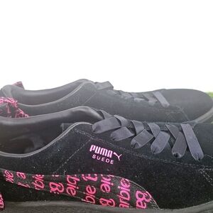 Stylish Puma sneakers with Barbie branding. Black base with vibrant pink accents. Perfect for casual wear.