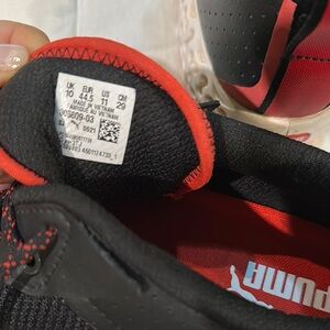 Puma x Ferrari Men’s RCT Xetic Forza, Motorsport Sneakers. Sleek Puma sneakers with a distinctive logo. Black upper with red highlights and laces. Puma:Ferrari. Men’s size 11.