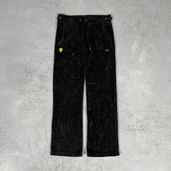 y2k puma ferrari velour track pants black luxury motorsport streetwear racing aesthetic soft cozy lounge joggers archive
